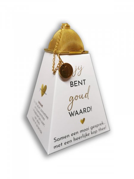 Uniek kado?Met deze thee piramide geef je de ontvanger een bijzondere beleving kado. Elke TheepiramideKado bevat twee zakjes thee van ieder 20 gram,een doosje met gesprekskaartjes en een thee-infuser in de vorm van een piramidezeefje met een medaillon ingegraveerd met een hartje.Een geweldige manier om samen te genieten van een goed gesprek,een moment van bezinning, of een speciale gelegenheid met een heerlijke kop thee!Van iedere THEE verpakking kun je eenvoudig meerdere kopjes smaakvolle thee bereiden. De biologische thee is zorgvuldig geselecteerd en met liefdeverpakt in de sociale werkplaats in Emmeloord.Wat zit er in iedere TheepiramideKado?- Twee zakjes thee van ieder 20 gram.- Thee-infuser in de vorm van een piramidezeefje met een medaillon ingegraveerd met een hartje.- Een doosje met 25 thema-gesprekskaartjes.Voor hoeveel kopjes thee zit er in elke TheepiramideKado?Met de 40 gram THEE kun je meerdere kopjes heerlijke thee zetten.Gebruik het piramidezeefje om de juiste hoeveelheid thee te doseren en geniet samen met je gezelschap van de bijgeleverde gesprekskaartjes.