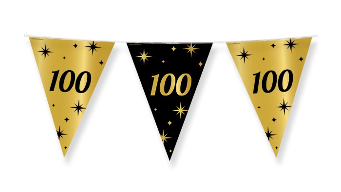 Classy Party flags foil - 100Geef elke feestelijke gelegenheid een stijlvolle uitstraling met deze feestelijke decoratie. Het luxe zwart-gouden kleurgebruik en het elegante design zorgen direct voor een chique sfeer en maken elke ruimte extra feestelijk.…