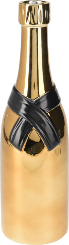 Breng een feestelijke sfeer in je interieur met deze unieke bloemenvaas in de vorm van een champagnefles. De vaas heeft een glanzende gouden afwerking met een zwarte sier strik om de hals, wat een luxueuze en feestelijke…