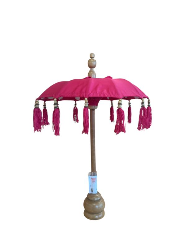 Breng een vleugje tropische charme naar je tafel met deze Bali Mini Parasol in een toffe roze kleur! Met zijn decoratieve franjes en compacte formaat (diameter 50 x H75 cm) is hij perfect als eyecatcher bij een zomerse…