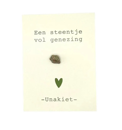 Cadeau kaartje unakietEen klein gebaar met een bijzondere betekenis. Dit kaartje van Side Dish bevat een unakiet steentje en de tekst een steentje vol genezing.Unakiet staat symbool voor balans en herstel, en helpt je om rust en harmonie te vinden. Een…
