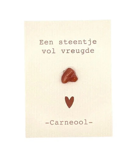 Cadeau kaartje carneoolEen klein gebaar met een mooie betekenis. Dit kaartje van Side Dish bevat een carneool steentje en de tekst een steentje vol vreugde.Carneool staat bekend om zijn warme energie en brengt positiviteit, moed en levenslust. Perfect…