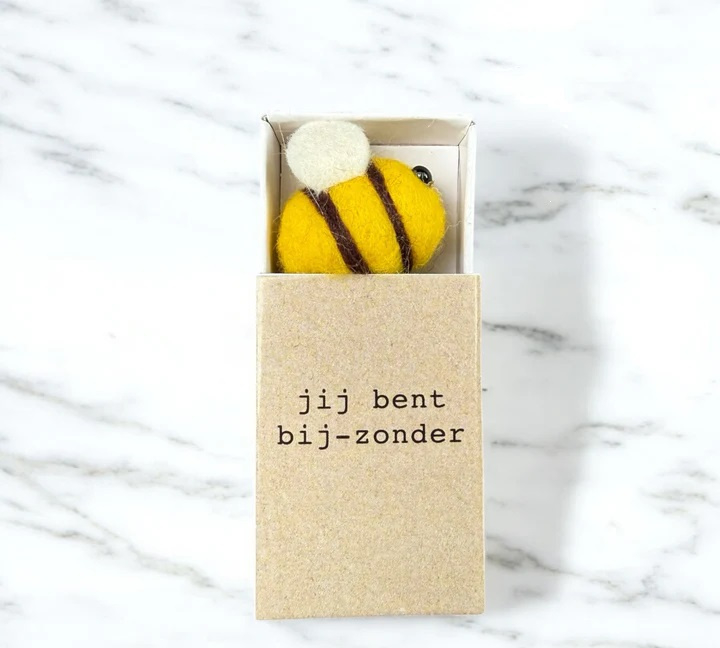 Bijen in doosjesVilten bij – Side DishDeze schattige handgemaakte vilten bij zit in een klein luciferdoosje (ca. 5 x 3 cm). Een klein cadeautje om iemand echt bij-zonder blij te maken!Handgemaakt met liefdeLeuk om te geven of te bewarenCompact…