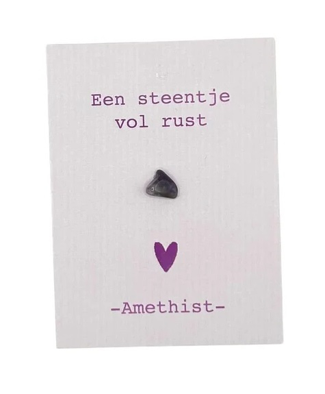 Cadeau kaartje AmethistEen klein gebaar vol rust. Dit kaartje van Side Dish bevat een amethist steentje en de tekst een steentje vol rust.Amethist staat bekend om zijn kalmerende energie en helpt je ontspannen, tot rust komen en helder denken. Een mooi…